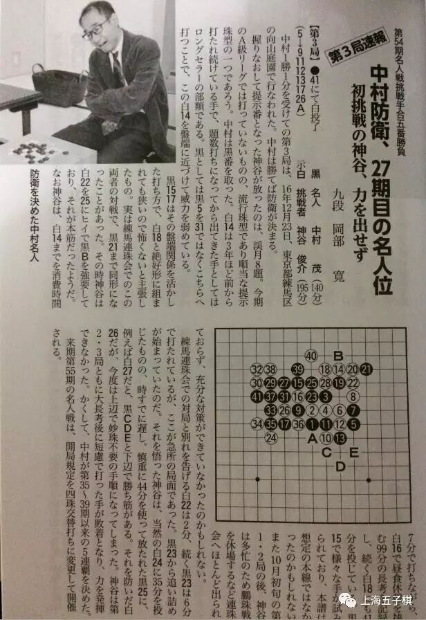 是役,双方大战“溪月”开局。神谷五段白22弈出败招,中村名人敏锐抓住机会,黑23后一口气连攻取胜,令观战者赞叹。