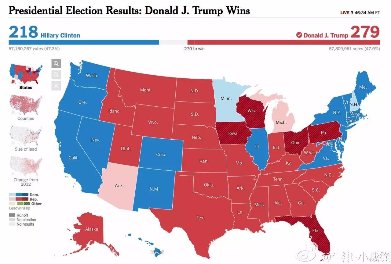 在今天的计票(大票)环节中,特朗普赢下一个又一个关键摇摆州,得票率先超过半数(270票),自然而然地问鼎白宫。