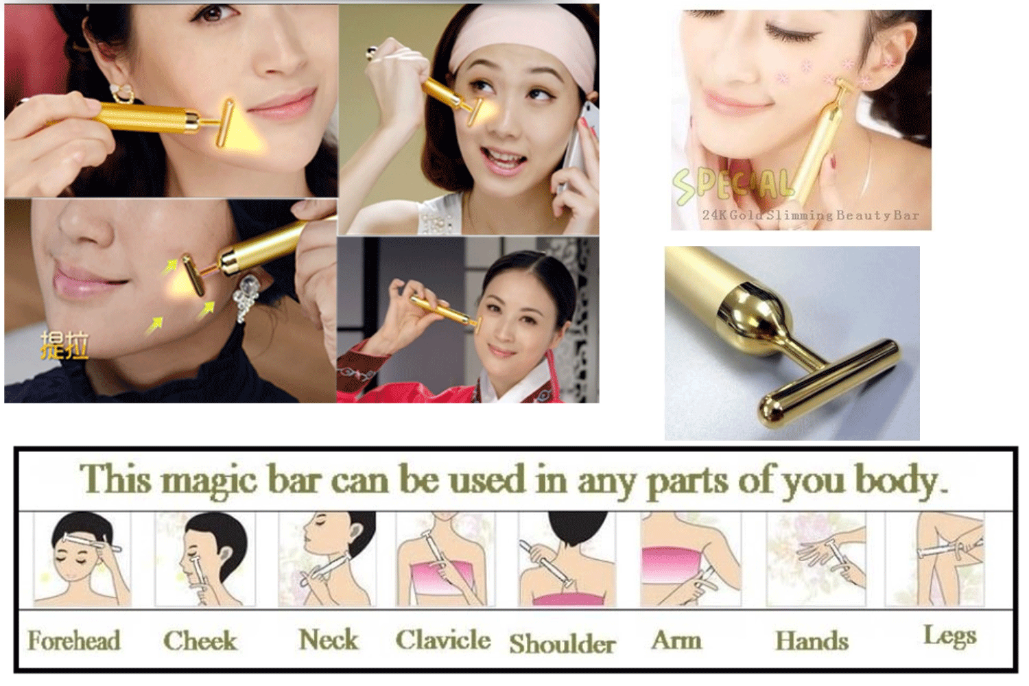原理:24K金美容棒可释放出纯金负离子,刺激真皮层分泌更多胶原蛋 白,填补萎缩和流失的胶原蛋白的空隙,使下垂松弛的皮肤得以提升并重新排列填平皱纹;同时刺激真皮层的 胶原质快速收缩,达到去除皱纹的效果。