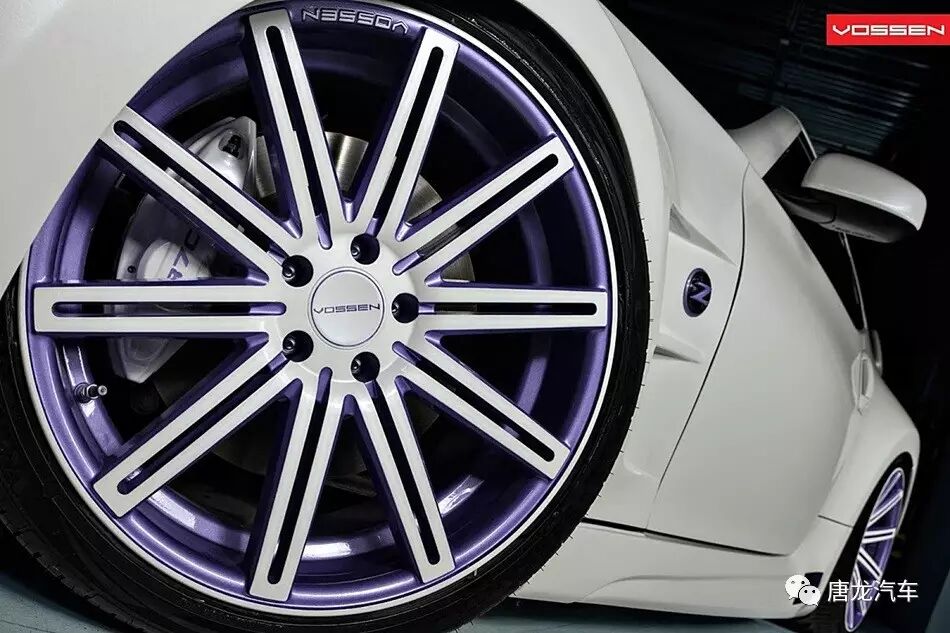 来到车侧,前叶子板改装了附有导流孔的制品,比对370Z原厂照,前叶子板并没有暴龟,而车身侧裙也改装体积更大的款式,使车身更加贴近地面;车尾造型相当别出心裁,后保杆总成有着丰富的线条,于两侧开了很小的导流孔,搭配下方所勾勒出的折线,使370Z有着独特的肌理线条,LED后雾灯两侧设计了两个三角形导流孔,不知道是装饰用还是真有其导流功能,另外,就是那支比车顶还要高的大型尾翼,整个车尾看起来相当「丰腴」!改装Vossen旗下的「CV4」系列铝圈,10幅双肋骨架相当简单大方,刻意搭配紫白车色将圈面烤成白色,其余部分则是烤成紫色,整辆370Z真可以用耀眼夺目来形容,选用规格为前9Jx20、后10.5Jx20,搭配前245/35 R20、后275/35 R20轮胎。