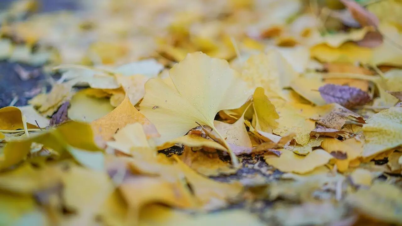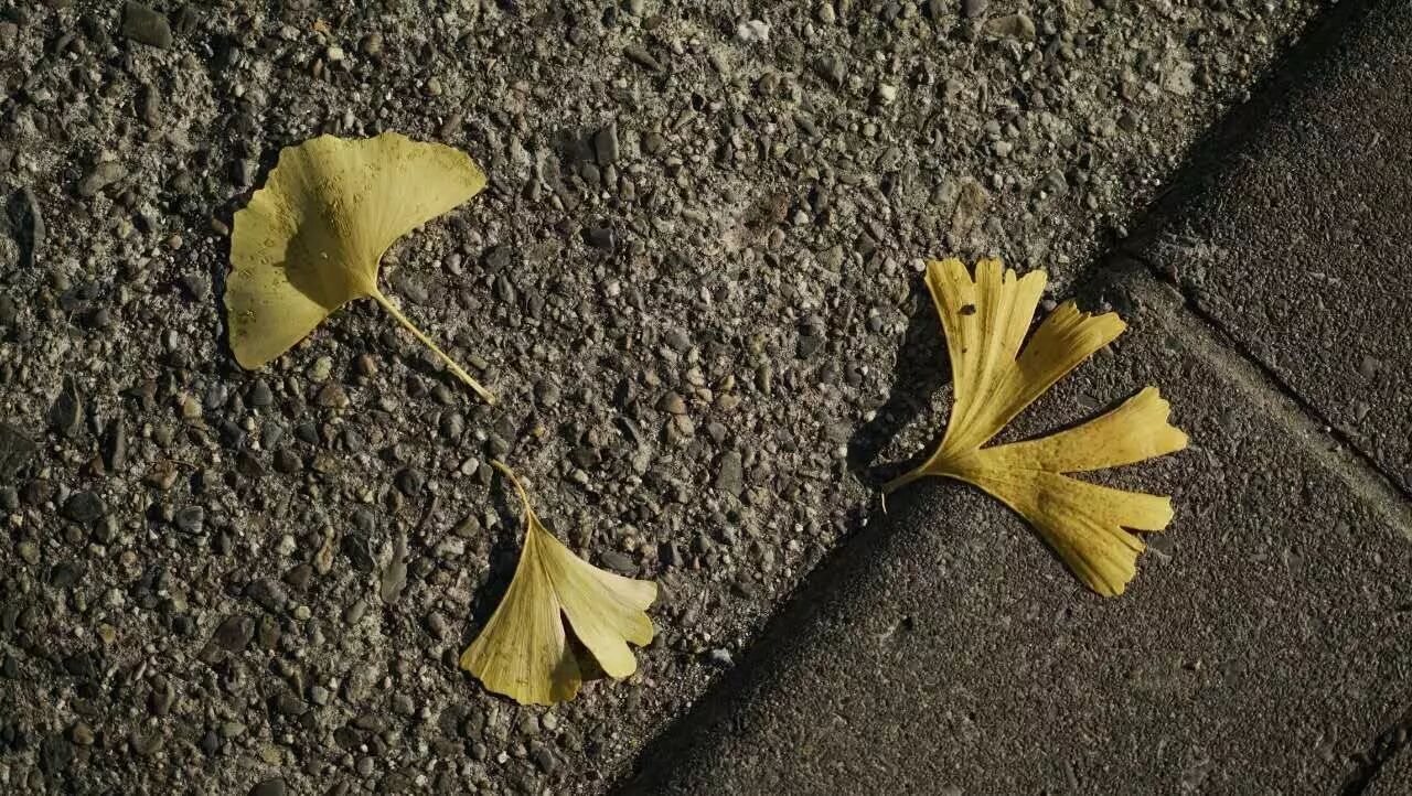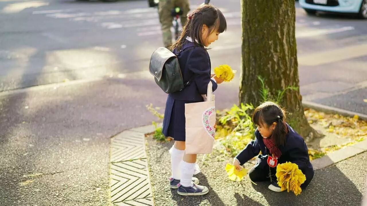 幼稚园放学,小朋友出门捡银杏叶子,一把如花