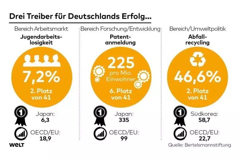 在各类世界排名中,德国一般都能名列前茅。贝塔斯曼对全球主要的41个发达国家进行了政府领导力调查,德国位列第六,排名不错,这不单单归功于德国强劲的经济实力。前五名分别为北欧国家和瑞士,而脱欧的英国排名第9,法国第18,日本第23,美国第28。为什么德国排名可观?又面临哪些威胁呢?