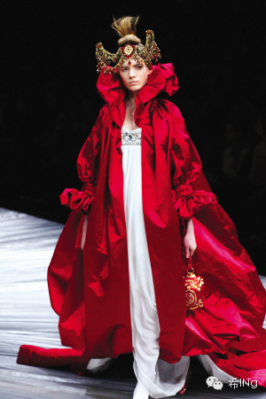 2001年春夏voss系列,红黑鸵鸟毛和红色载玻片长裙。