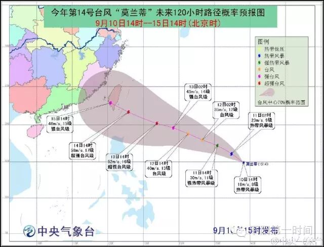 今年第14号台风“莫兰蒂”(热带风暴级,英文名:Meranti;名字来源:马来西亚;名字意义:一种树)于今天(10日)下午2点钟在西北太平洋洋面上生成,下午5点钟其中心位于我国台湾省花莲市东偏南方大约2000公里的西北太平洋洋面上,北纬15.1度、东经138.5度,8级(18米/秒),998百帕,七级风圈半径80-120公里。