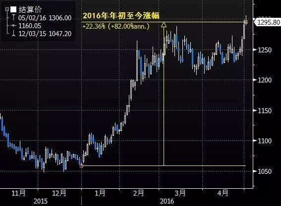 五一节日期间,国际金价大涨。国际黄金期货升破每盎司1300美元,最高升至1303.60美元/盎司,创15个月新高,随后进行稳定调整,收盘价格暂时稳定于1291.40美元/盎司。美元指数跌至11个月新低,机构投资者大幅增持黄金,金价过去一周飙升5% 。