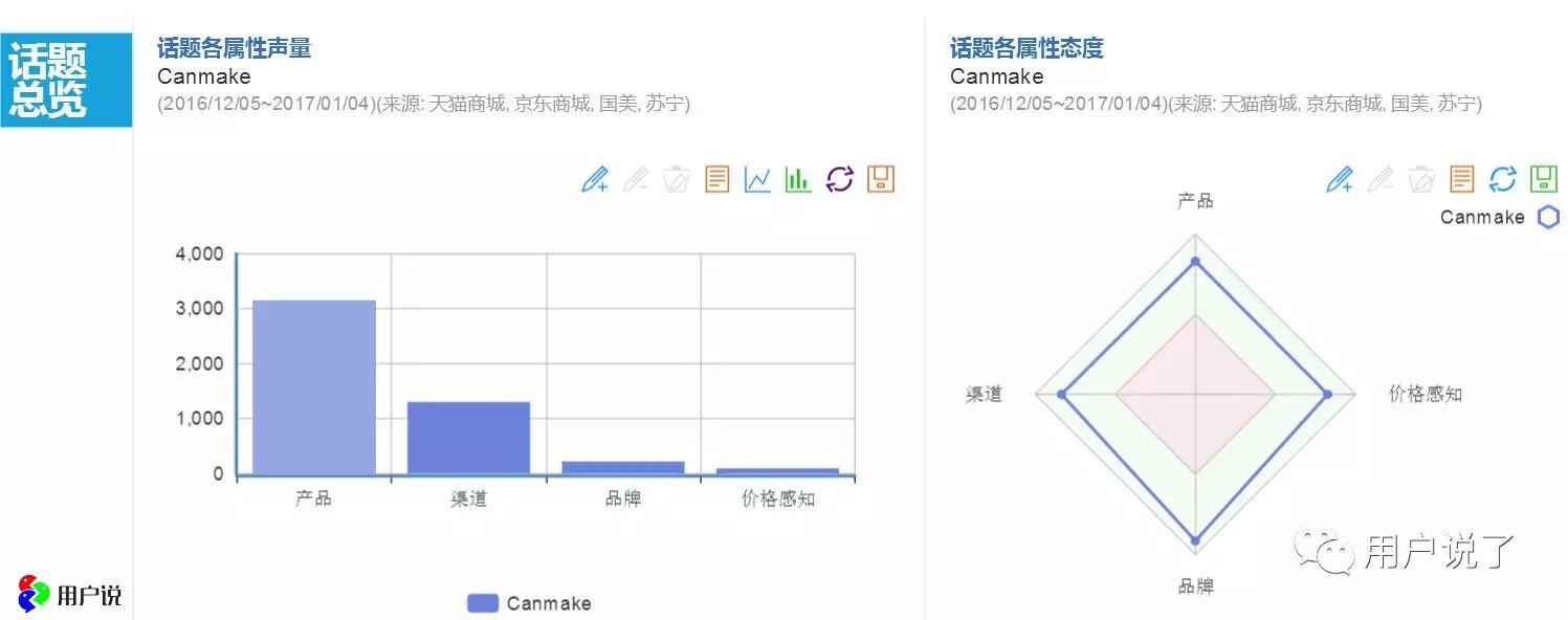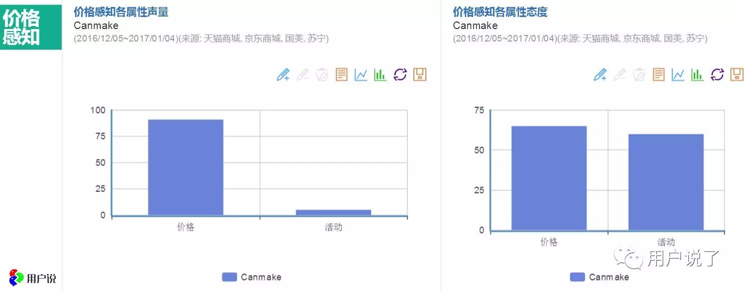 在话题总览中可以看出,消费者对CANMAKE评价最高的是品牌,评价最差的是价格感知。CANMAKE一直以平民白菜价获得消费者的欢心,但在价格感知属性态度中,其满意度只有65分,用户说分析师认为,CANMAKE主要是品牌活动较少,消费者优惠购买的心理没有得到满足,建议CANMAKE多举行品牌活动,一是加深与消费者的连结,巩固品牌会员的忠诚度;一是减少消费者对品牌价格的负面评价,提升品牌形象。
