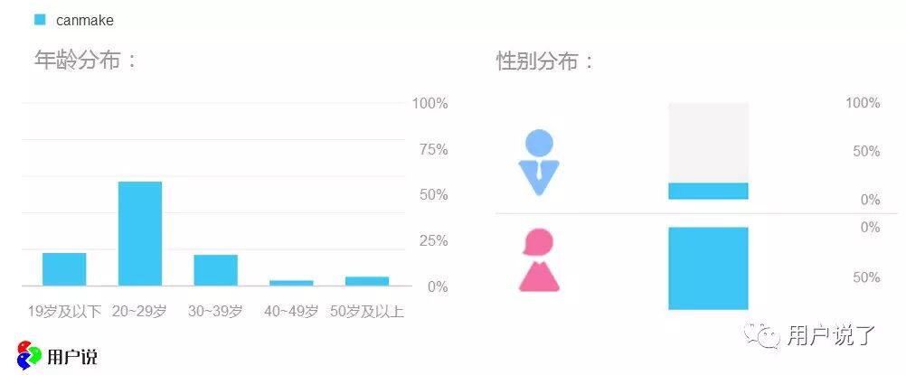 从百度指数的人群属性中可以发现,CANMAKE的潜在消费者的年龄聚集在20-29岁,高达48%的占比。性别分布上,女性以压倒性的比例成为品牌的核心客户群。用户说分析师认为,CANMAKE产品丰富多元化,主打以平民白菜价的高品质化妆品给予消费者,20-29岁的女性消费者购买欲望强而经济实力较弱,CANMAKE势必成为了她们心中物美价廉、产品丰富的品牌之选。