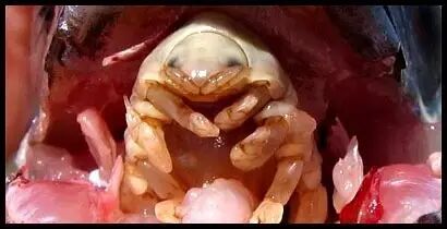 缩头鱼虱,学名 Cymothoa exigua ,属于节肢动物门软甲纲等足目缩头水虱科缩头水虱属,是一种甲壳类动物,和虾、蟹之类沾点亲(聪明的小伙伴会发现它和寄居蟹长得有点像)。