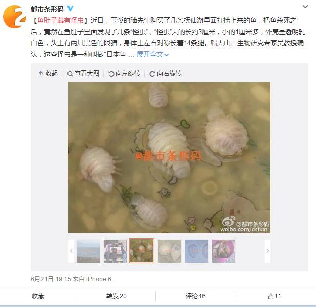 6月21日,“都市条形码”发布了一条“抚仙湖里面打捞上来的鱼的肚子藏有怪虫”的信息。此信息一出引起不少网民关注,其中不少明智的网民发现该“怪虫”并不是“日本鱼怪”,它学名“鱼虱”属于节肢动物,俗称水臭虫,抚仙湖发现的鱼虱为最常见的“日本鱼虱”。