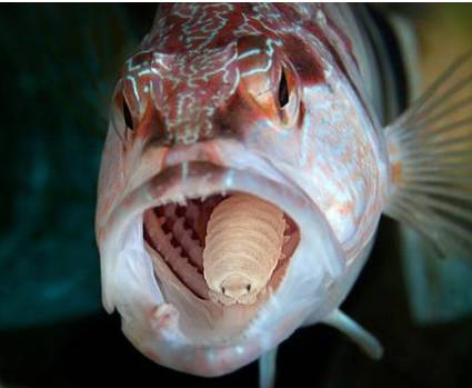 在幼虫时进入鱼类的口腔内,通过鱼的舌头吸食鱼的血液,直到鱼的舌头萎缩。然后将自己的尾部与已经萎缩的鱼舌连接起来代替鱼舌工作,由寄生转为共生。