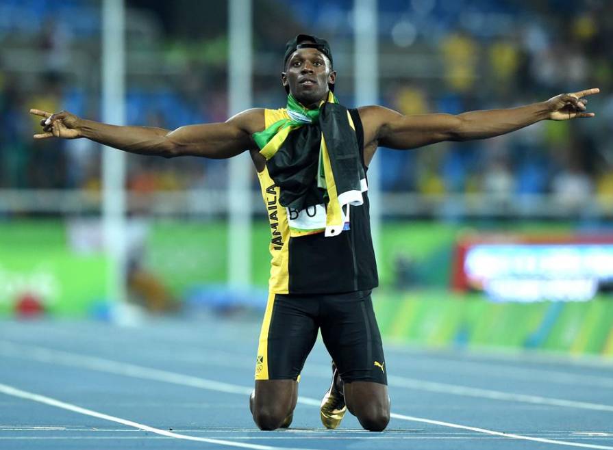 牙买加队选手博尔特赛后跪在赛道上庆祝夺冠。当日,在2016年里约奥运会田径男子4x100米接力决赛中,牙买加队以37秒27的成绩获得冠军。