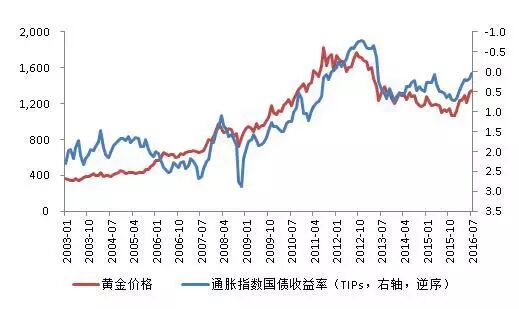 实际上人们投资黄金,从本质上说是将黄金看成配置性资产的一种,所以实际利率是影响黄金价格的主要因素。十年期通胀指数美国国债收益率来反映实际利率,与黄金价格进行比较发现,二者呈高度负相关(参见下图),十年期通胀指数国债收益率可以解释75%的黄金价格变动。