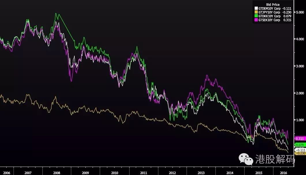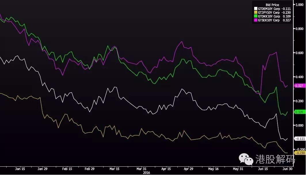 日本央行通过量化宽松,好不容易将日元推低至110左右,以刺激出口和消费,如今被英国退欧事件一闹,日元似乎是“一夜回到解放前”。作为避险工具的政府长期债券,本来因负利率的推行,收益率随之下行,今年以来,德国、日本、丹麦和瑞典的10年期长债收益率已震荡向下,英国脱欧后,避险资金涌入,他们的收益率更是急跌,日债跌至最低,到负0.23厘。