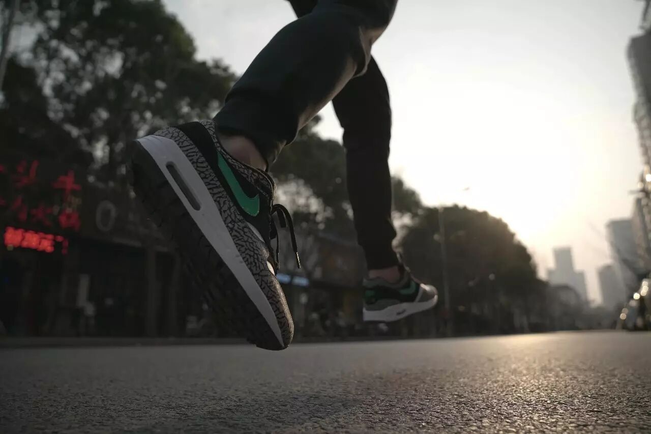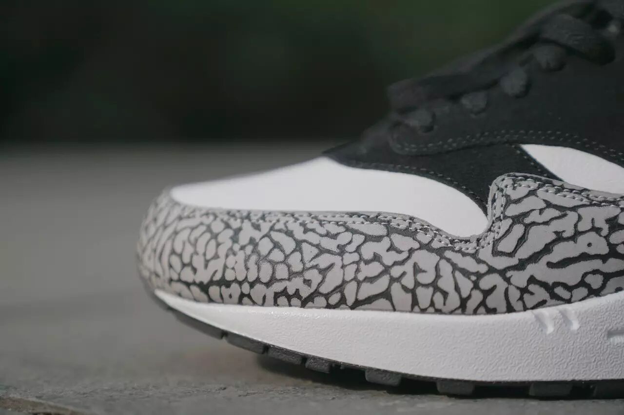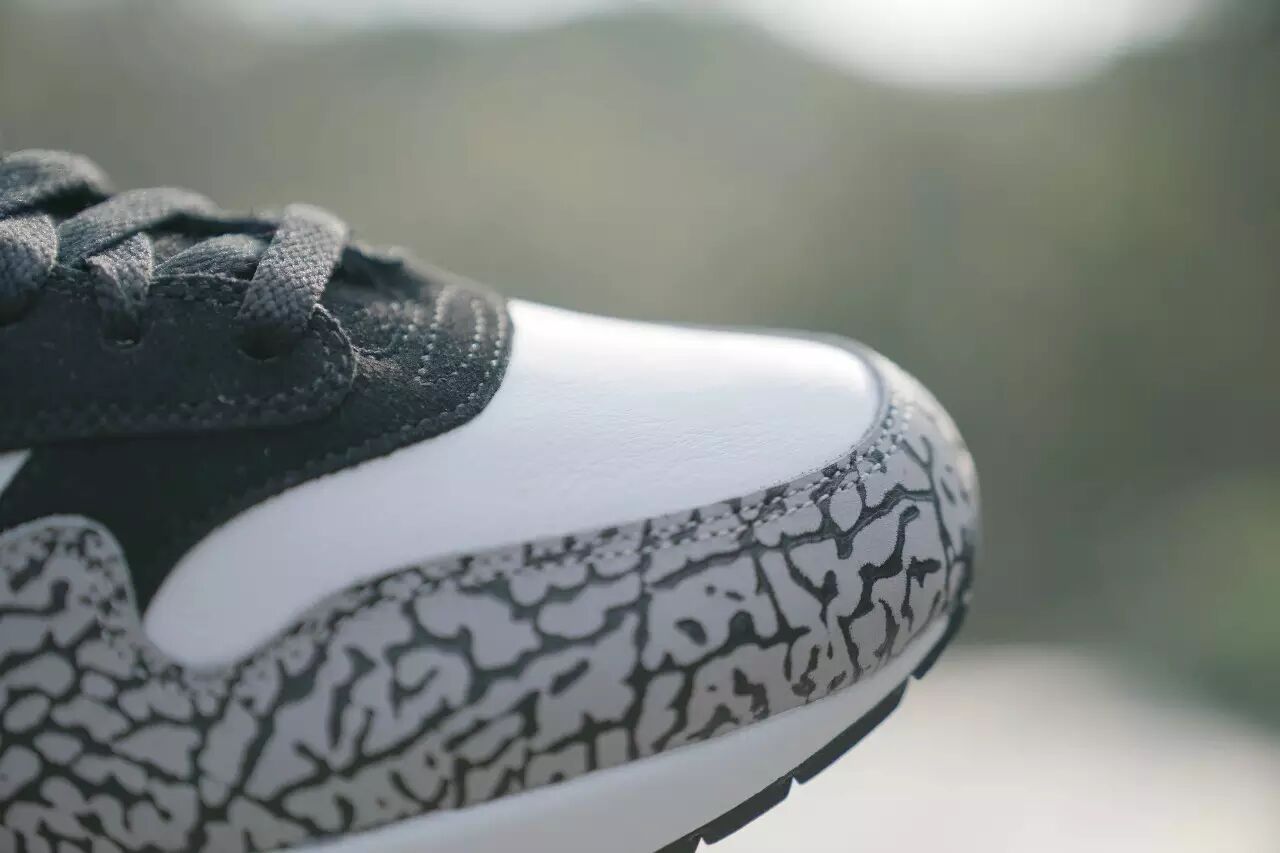 既然叫做Air Max 1 Atmos Elephant,那么这款鞋的特点自然是它鞋身那一圈大象纹的挡泥板。Air Jordan 3上的标志性元素大面积地运用在Air Max 1上,别具一番风味。
