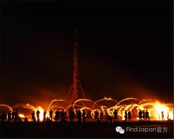围绕着大火把的人们笑着走着,像约好了似的一齐将手中的小火把扔向高高的大火把,只见噌的一下燃起冲天火柱,这就是壮观的能等岛向田火祭典。