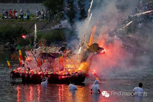 船头大都是龙头的样子,所以被称为“舟っこ”。做好的“舟っこ”在盂兰盆节期间(迎盆日到送盆日)会在寺庙、社区展示,接受当地的供奉。送盆日的傍晚,小船们就会被统一移到明治桥上游(浮岛公园遗址),在诵经等一系列仪式结束后,由穿着兜裆布的男子抬下河、点燃、任其漂流。以此慰藉先灵、祈祷祛病消灾。