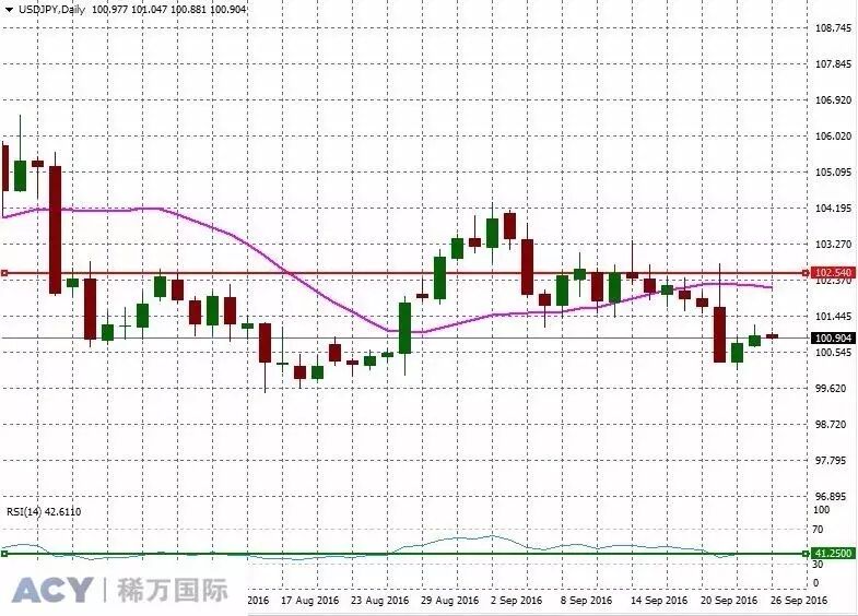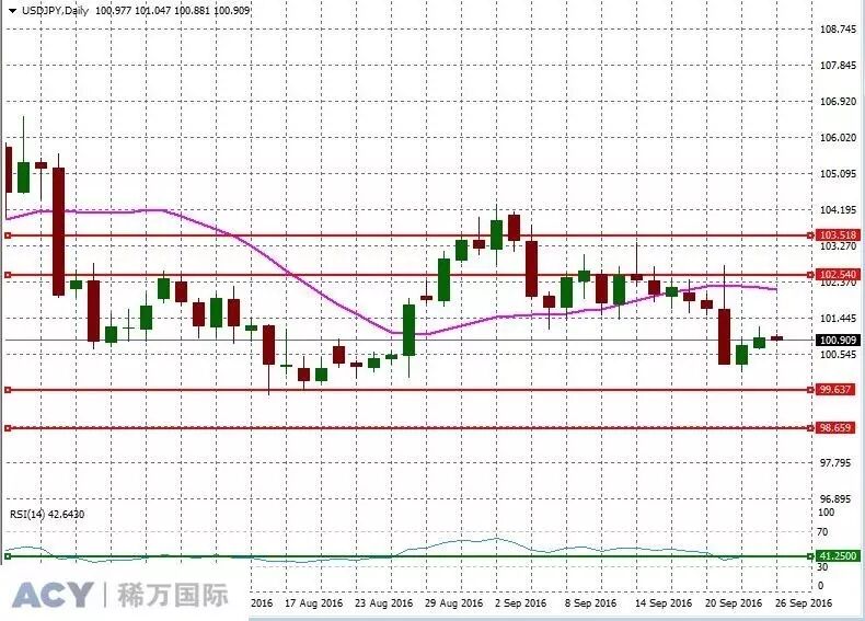 图一:美元/日元日线走势图周五(9月23日),美元/日元继续走强,日线周期上,汇价盘中最高已击穿前期下破的颈线位101.21。周一(9月26日)亚洲时段,投资者首先需要关注各个品种开盘的情况,来自周末的消息可能给市场开盘走势带来影响。接着投资者重点关注中国市场的情况,稍加留意日本的领先指标数据。欧洲时段,欧元区方面,关注德国IFO商业景气指数。英国方面,关注英国房屋抵押贷款许可数据,近来英国脱欧引发的忧虑重新被市场炒作,投资者等待良好英国经济数据对英镑汇价的救赎。另外,时段内国际能源论坛还会召开。投资者关注在论坛会议间隙OPEC成员国的讨论情况。纽约时段,投资者密切关注美国的新屋销售数据,另外留意欧洲央行行长德拉基的讲话。同时关注美股和油价的走势,从而把握市场情绪变化的走向。20日线移动平均线指标显示,汇价目前仍维持在20日均线附近下方,多头力量弱于空头力量;RSI(14)均衡指标显示,趋势线位于接近50附近下方,显示短期价格力度整体运行整体震荡偏弱,操作上可遵循顺势趋势。日内留意日本的领先指标数据,重点关注中国市场的情况,密切关注美国的新屋销售数据。日线图显示,美元/日元短期支撑和阻力参考,如图二:![]()